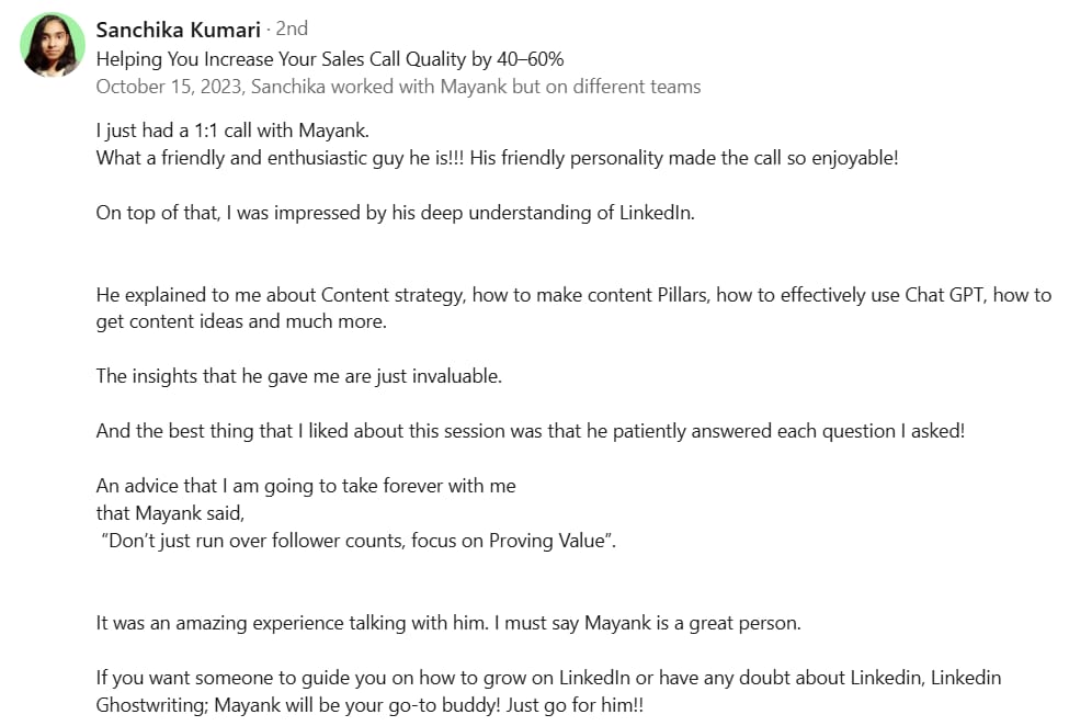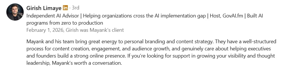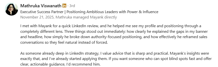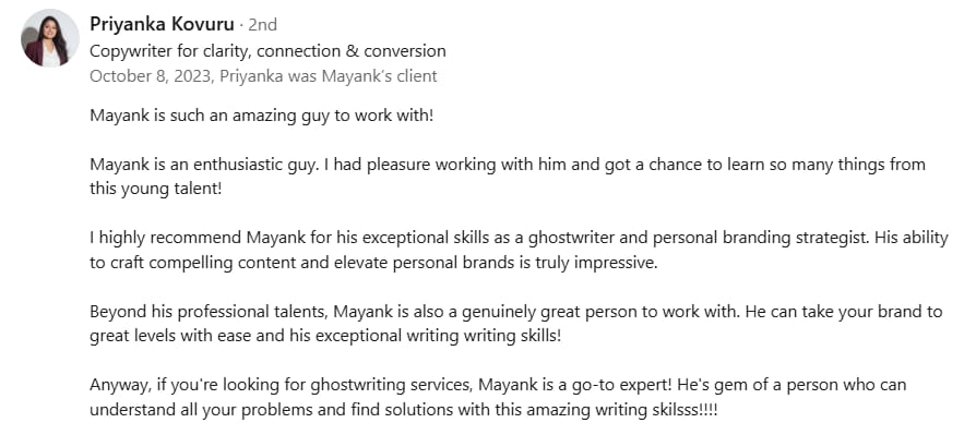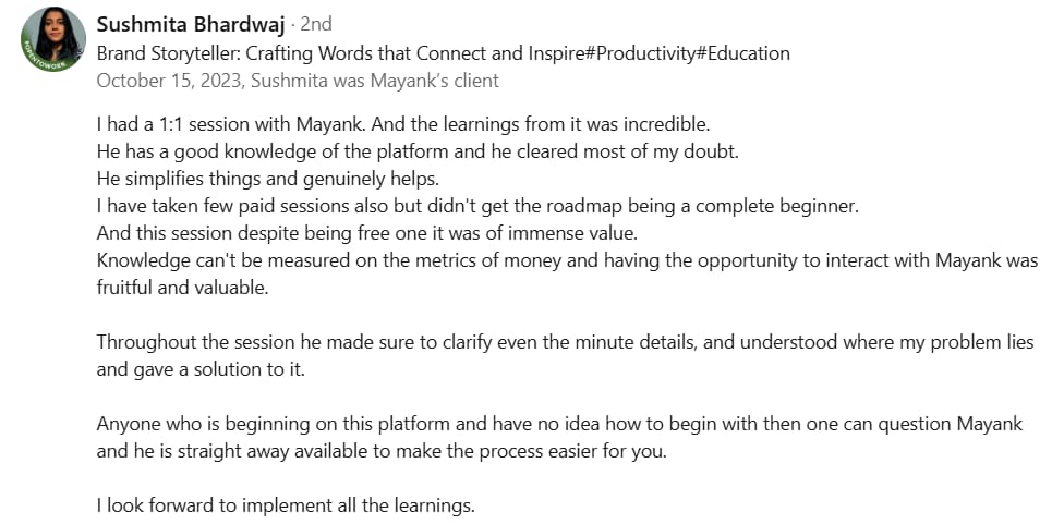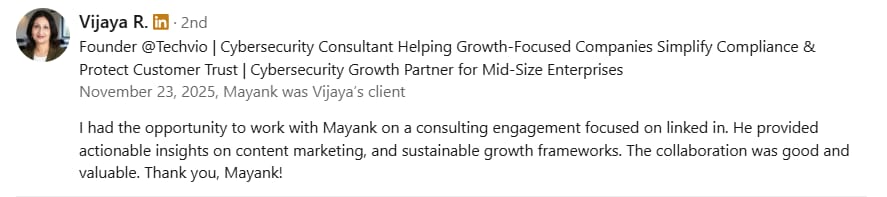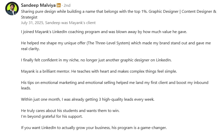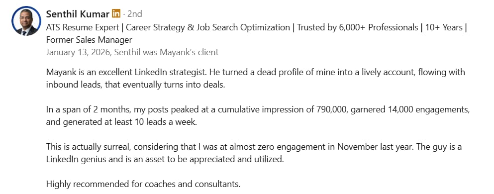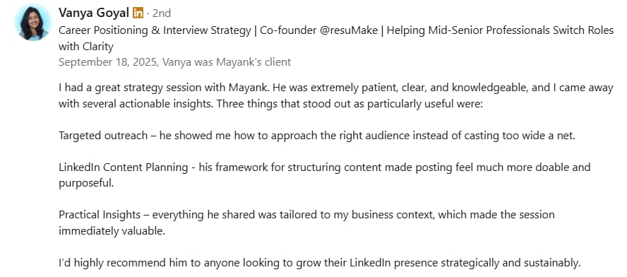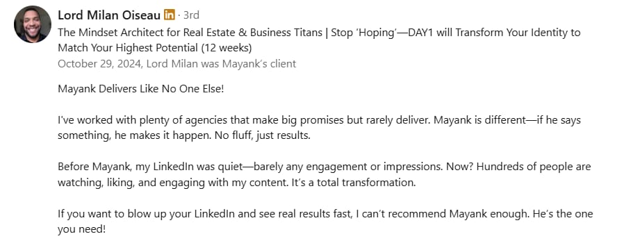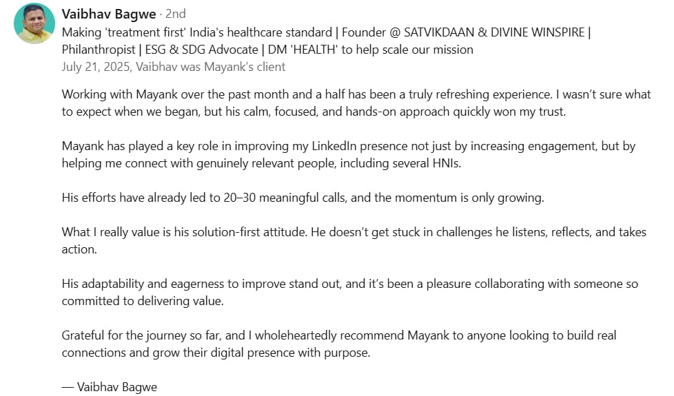 Before Mayank, my LinkedIn was barely moving. My posts got 300-400 views, and nobody was engaging. But in just 2 weeks, he took my impressions to 1000-2000 and boosted my engagement to over 100+. If you want real results on LinkedIn, Mayank is the one to go to.