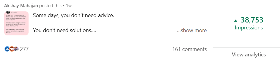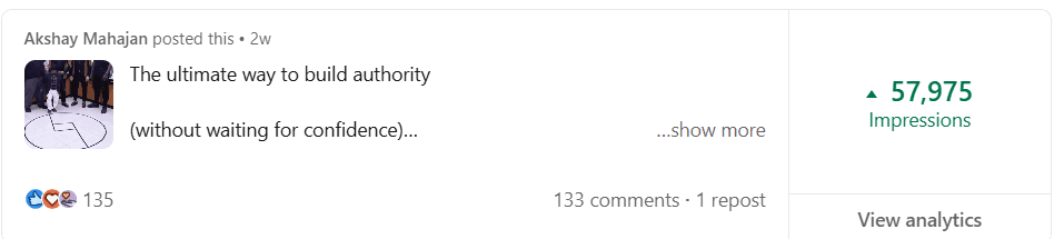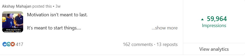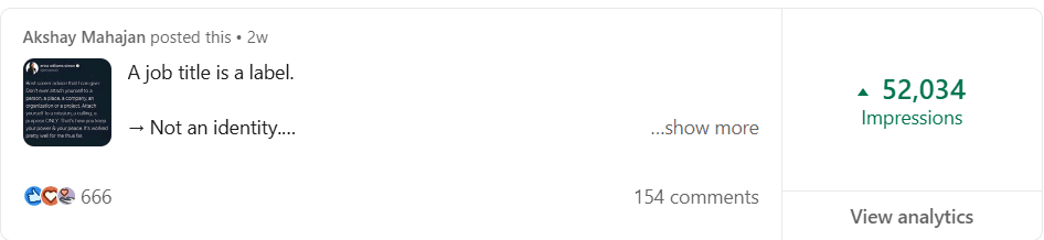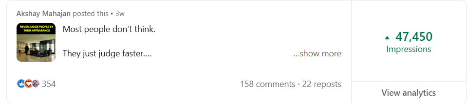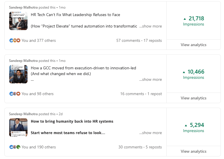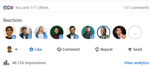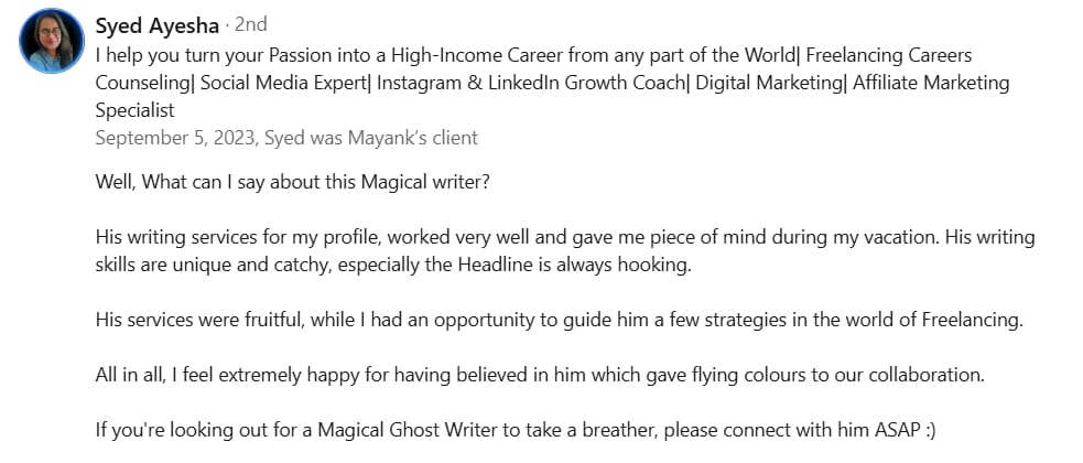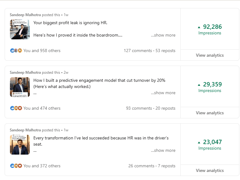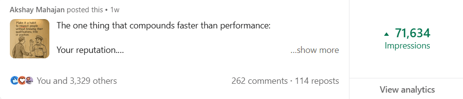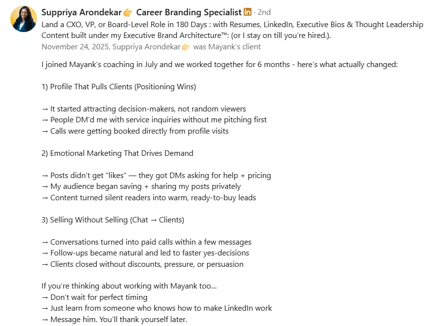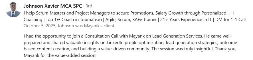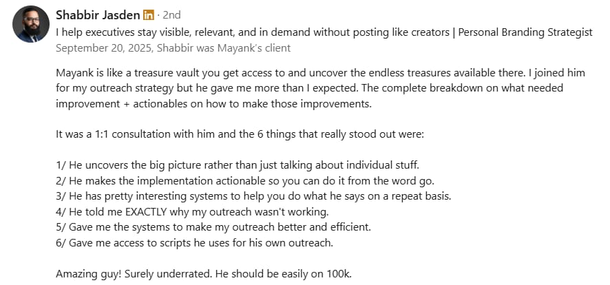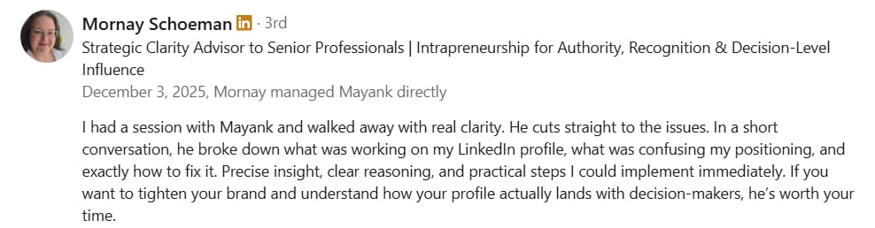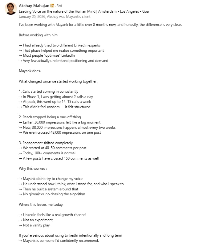 Before Mayank, my LinkedIn was barely moving. My posts got 300-400 views, and nobody was engaging. But in just 2 weeks, he took my impressions to 1000-2000 and boosted my engagement to over 100+. If you want real results on LinkedIn, Mayank is the one to go to.
